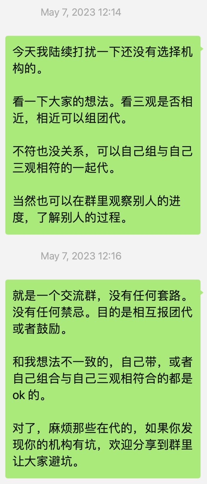 | 交付定金 | 被机构诈骗:机构跑路、或者是跑路前最后一撸、或者压根整个就是骗局,根本没有代的能力。 | 一般这个只能骗到定金。所以定金宜较少为佳。金额小,甚至警方都不与立案。但多人团被骗,可能能增加警方的压力。 | 中 | 定金金额要足够小,向机构表示诚意即可。目前大部分机构要求 2w,我们可以谈成 2k,这样损失降低在可控范围,或是直接立联名账户跳过此阶段。 |