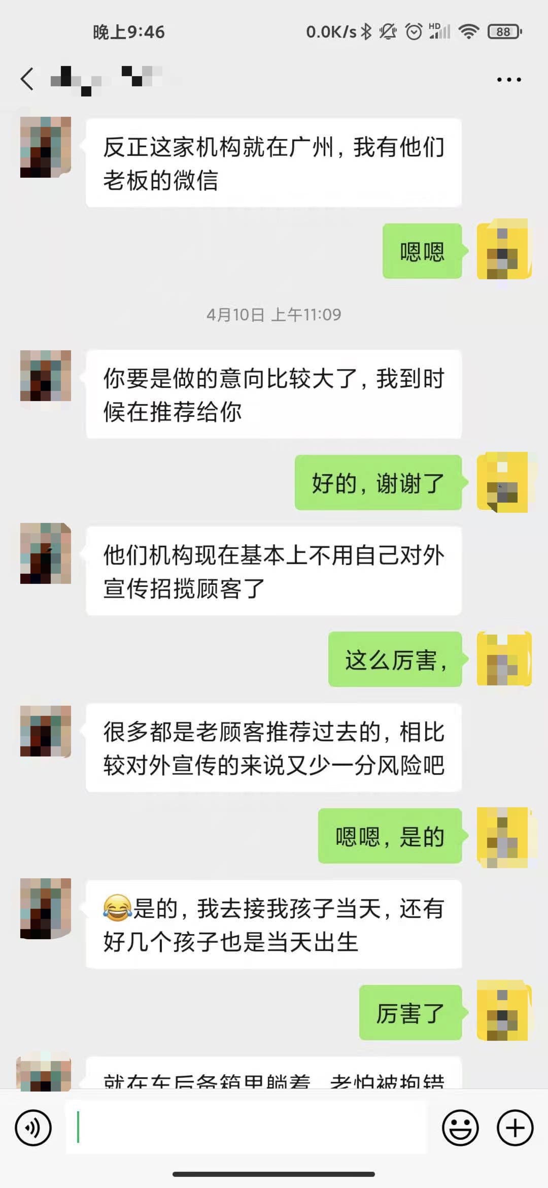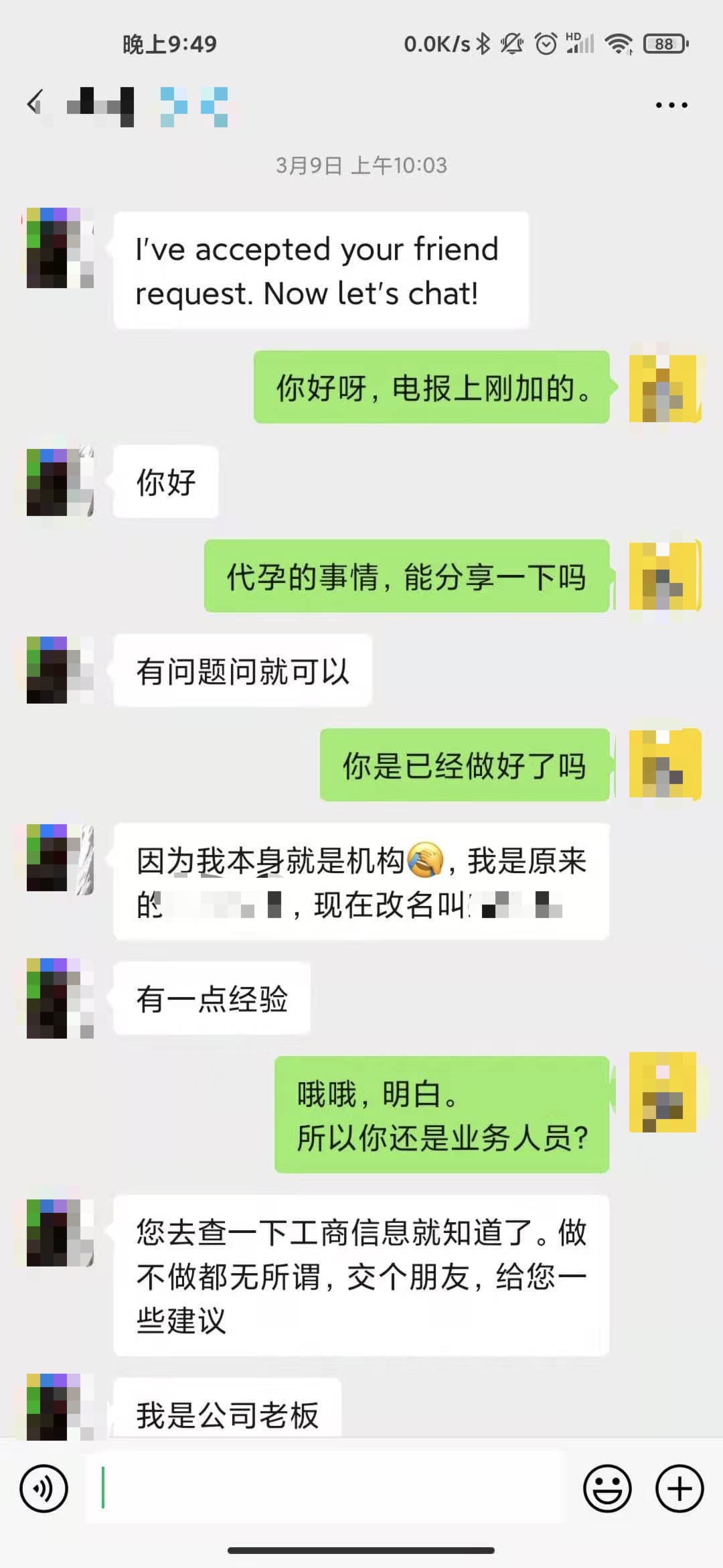 对于说两句话就甩机构联系方式给我的人,当然有少部分人确实是因为自己做过的机构好让我试试,但是绝大部分就是代孕销售建的小号。